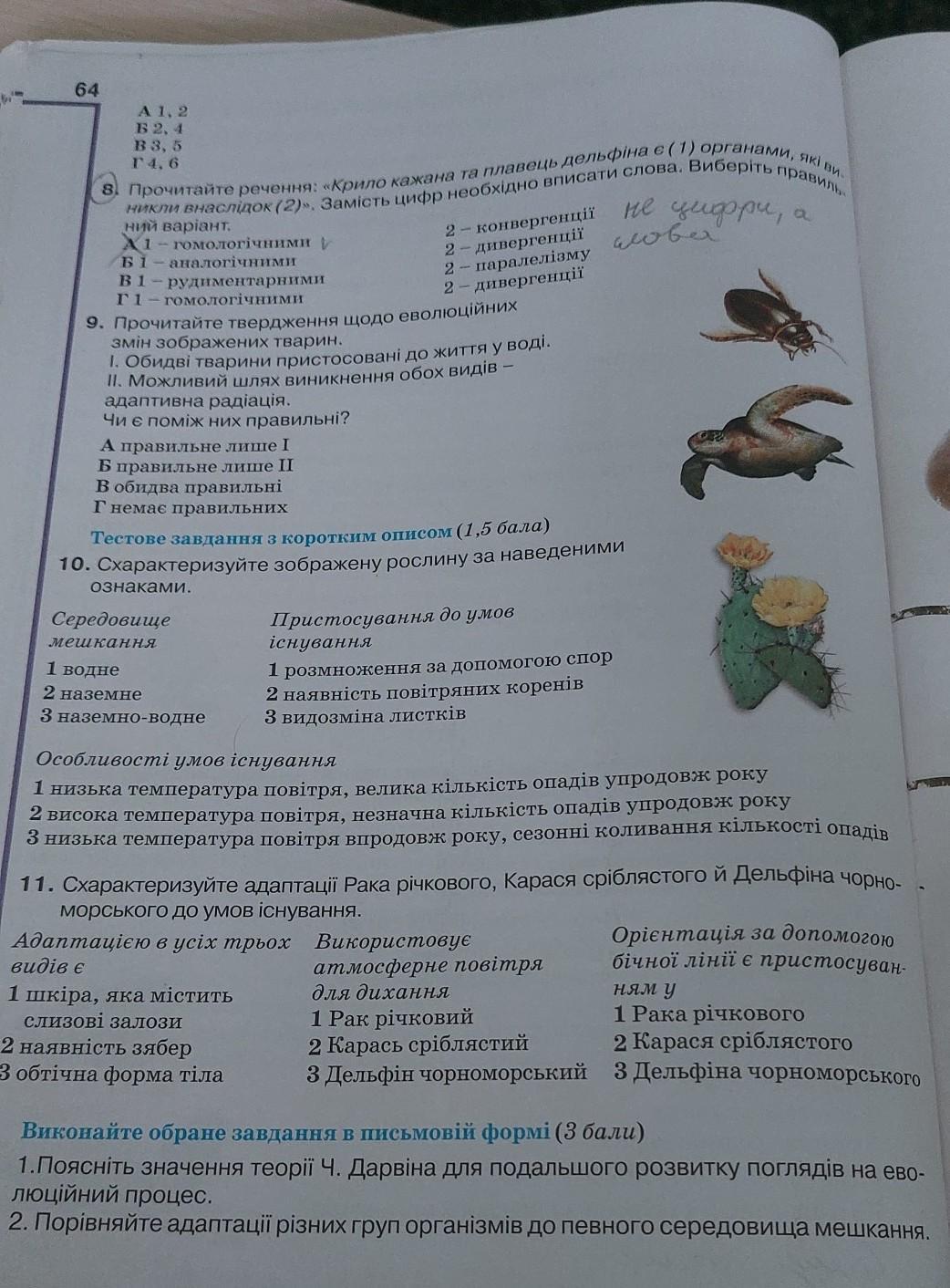 64 A 1,2 Б 2, 4 B 3, 5 14,6 8. Прочитайте речення: «Крило кажана та плавець дельфіна € (1) органами, які ви никли внаслідок (2)». Замість цифр необхідно вписати слова. Виберіть правиль цифри, ний варіант. А 1 - гомологічними Б 1 - аналогічними рудиментарними В 1 - I 1 - гомологічними 9. Прочитайте твердження щодо еволюційних змін зображених тварин. 1. Обидві тварини пристосовані до життя у воді. II. Можливий шлях виникнення обох видів - адаптивна радіація. Чи є поміж них правильні? А правильне лише I Б правильне лише II В обидва правильні Г немає правильних ознаками. 2-конвергенції 2-дивергенції 2-паралелізму 2 - дивергенції Тестове завдання з коротким описом (1,5 бала) 10. Схарактеризуйте зображену рослину за наведеними Середовище мешкання 1 водне 2 наземне З наземно-водне не слова 1 шкіра, яка містить слизові залози 2 наявність зябер З обтічна форма тіла Пристосування до умов існування 1 розмноження за допомогою спор 2 наявність повітряних коренів 3 видозміна листків Особливості умов існування 1 низька температура повітря, велика кількість опадів упродовж року 2 висока температура повітря, незначна кількість опадів упродовж року З низька температура повітря впродовж року, сезонні коливання кількості опадів a 11. Схарактеризуйте адаптації Рака річкового, Карася сріблястого й Дельфіна чорно- морського до умов існування. Адаптацією в усіх трьох видів є Використовує атмосферне повітря для дихання 1 Рак річковий 2 Карась сріблястий 3 Дельфін чорноморський Орієнтація за допомогою бічної лінії є пристосуван- ням у 1 Рака річкового 2 Карася сріблястого 3Дельфіна чорноморського