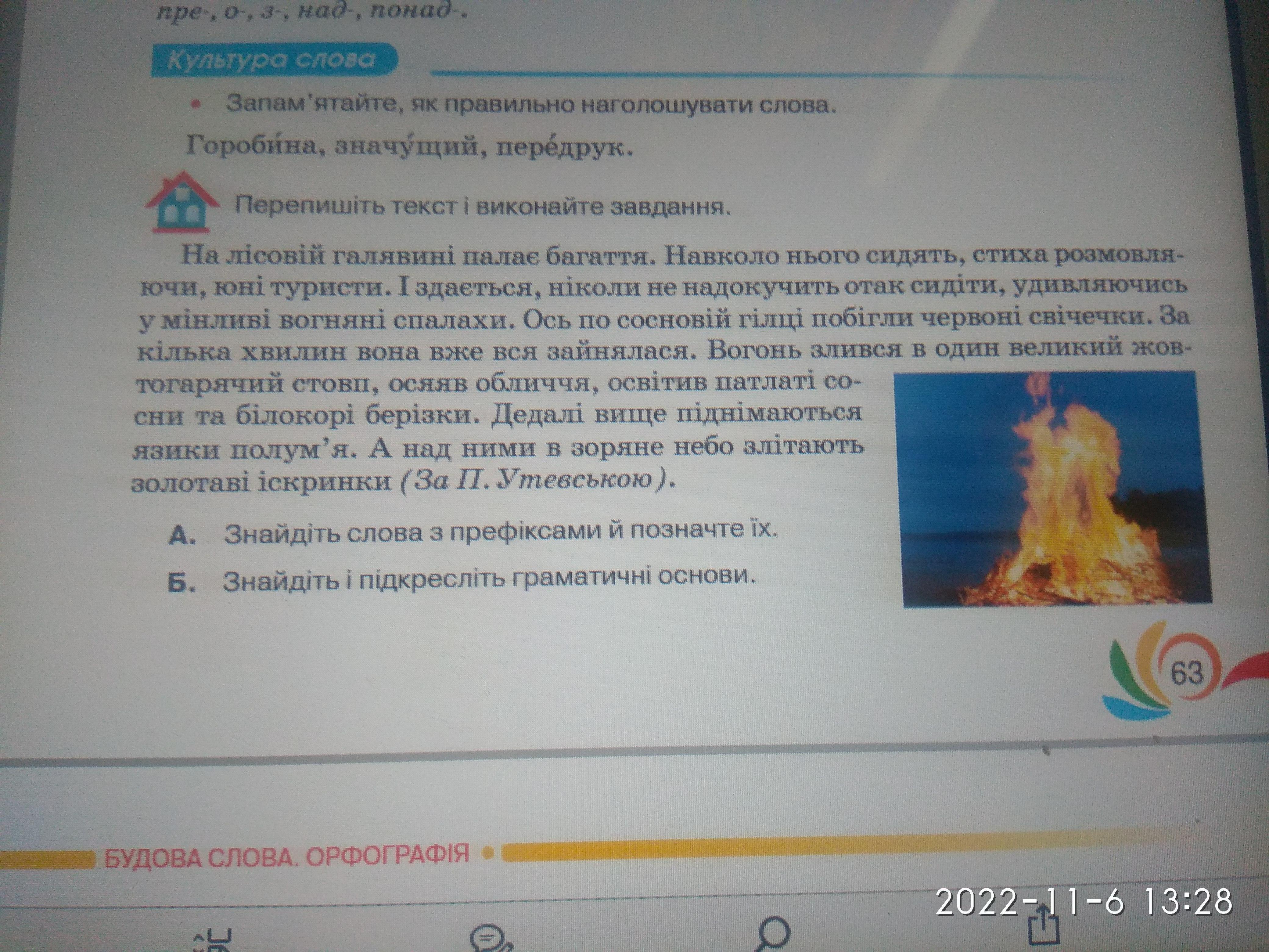 Б. палає (діє сл.) багаття (ім.) побігли д. свічки ім. вогонь ім. побіг д. злітають д іскринки ім