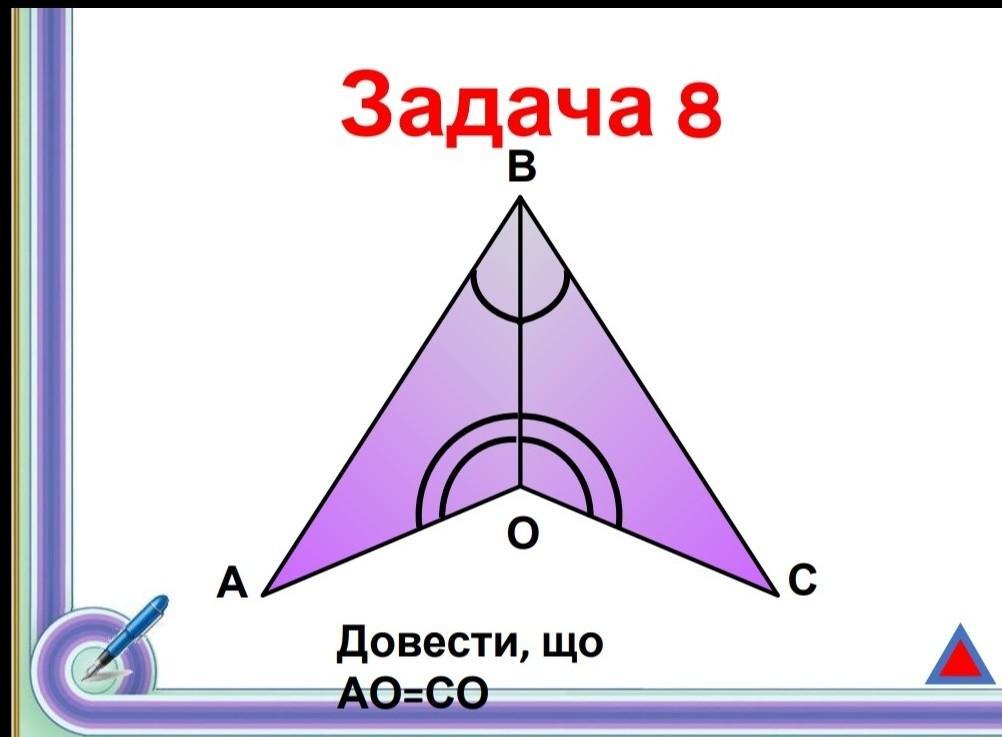 ΔАОВ=ΔСОВ (ВО - спільна сторона, ∠АВО=∠СВО, ∠АОВ=∠СОВ), отже АО=СО. Доведено.