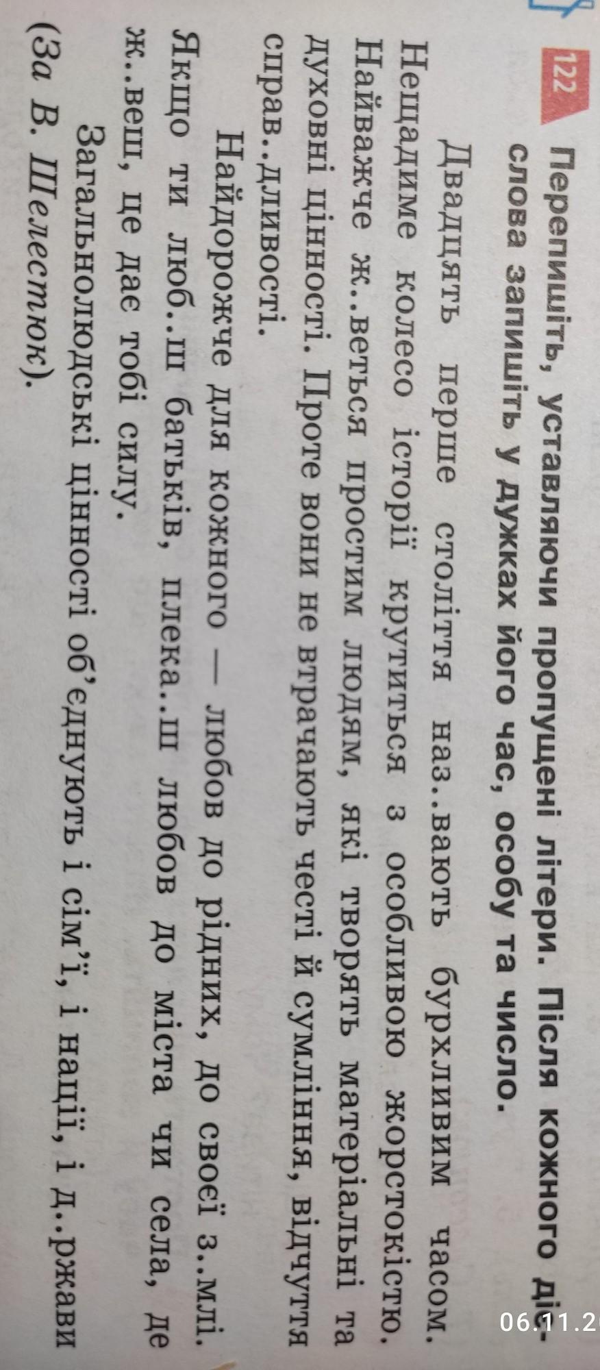 Перепишіть, уставляючи пропущені літери. Після кожного діє- слова запишіть у дужках його час, особу та число.