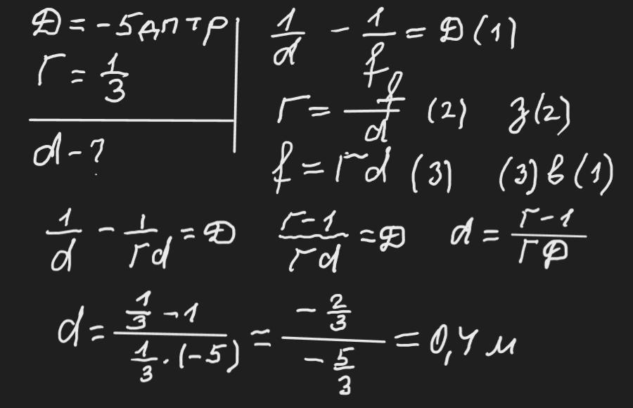 Лінза з оптичною силою -5 дптр дає зображення предмета, зменшене втричі. Визначіть відстань між лінзою та предметом. Даю 100 балов