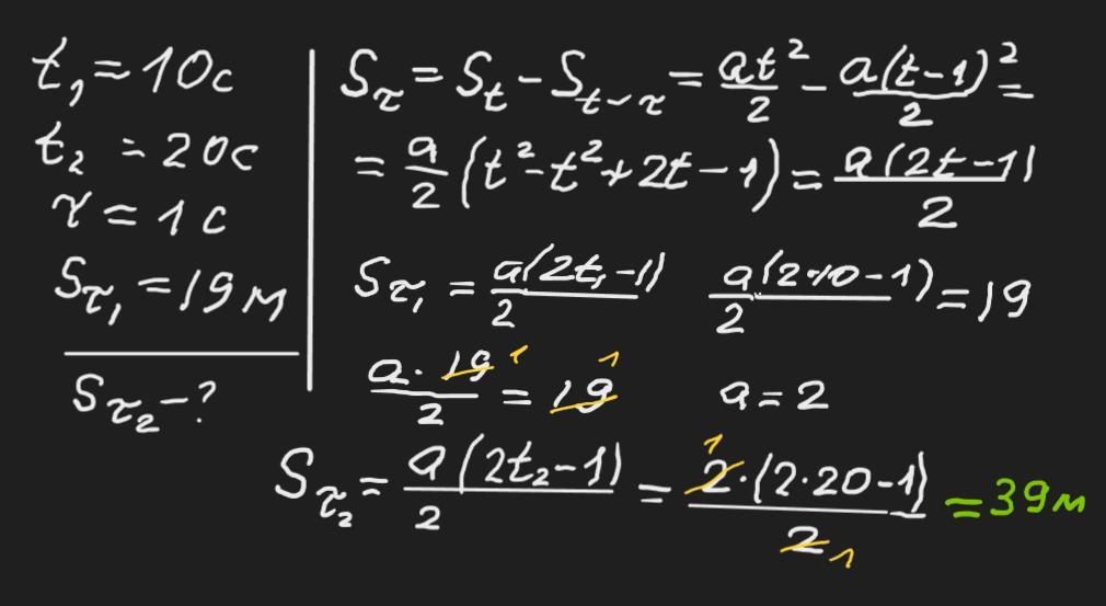 Під час рівноприскореного руху зі стану спокою тіло за десяту секунду пройшло відстань 19 м. Яку відстань пройде тіло за двадцяту секунду?