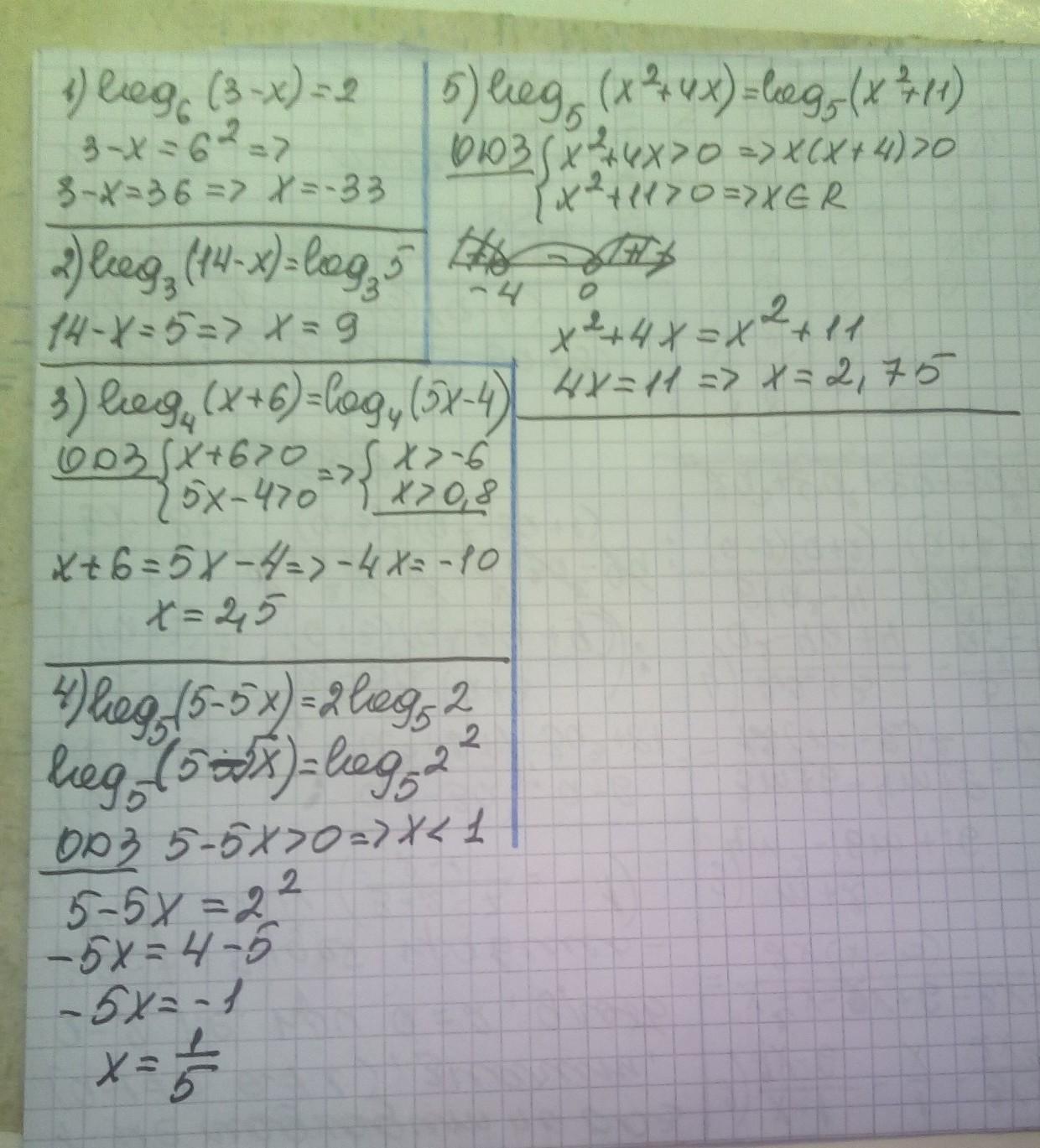 Решить логарифмические уравнения 1)log6(3-x)=2; 2)log3(14-x)=log3 5; 3)log4(x+8)=log4(5x-4); 4)log5(5-5x)=2log5 2; 5)log5(x²+4x)=log5(x²+11).
