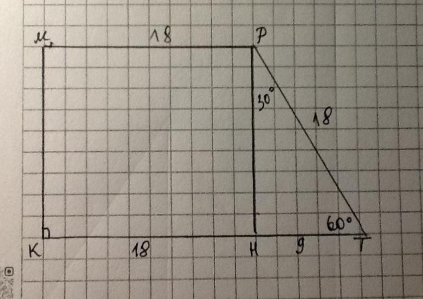 Дано: КМРТ - трапеція, МК⊥КТ, ∠Т=60°, МР=РТ=18 см. КТ - ?