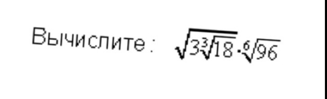 1) ![sqrt{3 sqrt[3]{18} } sqrt[6]{96} = sqrt[6]{18*3^3*96} = sqrt[6]{2*3^2*3^3*2^5*3}= \ \=sqrt[6]{2^6*3^6}=2*3=6 sqrt{3 sqrt[3]{18} } sqrt[6]{96} = sqrt[6]{18*3^3*96} = sqrt[6]{2*3^2*3^3*2^5*3}= \ \=sqrt[6]{2^6*3^6}=2*3=6](https://tex.z-dn.net/?f=+sqrt%7B3+sqrt%5B3%5D%7B18%7D+%7D+sqrt%5B6%5D%7B96%7D++%3D+sqrt%5B6%5D%7B18%2A3%5E3%2A96%7D+%3D+sqrt%5B6%5D%7B2%2A3%5E2%2A3%5E3%2A2%5E5%2A3%7D%3D++%5C+%5C%3Dsqrt%5B6%5D%7B2%5E6%2A3%5E6%7D%3D2%2A3%3D6+++)