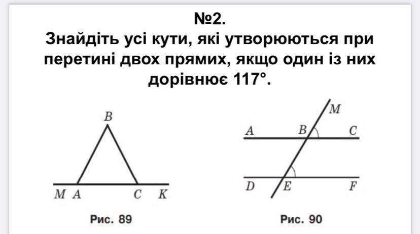 Знайдіть усі кути, які утворюються при перетині двох прямих, якщо один із них дорівнює 117°