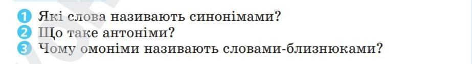 1 Синоніми — слова, які звучать по-різному, але мають приблизно однакове лексичне значення.