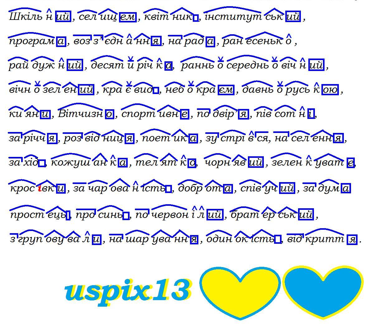 Шкільний, селищем, квітник, інститутський, програма, возз’єднання, нарада, ранесенько, райдужний, десятирічка, ранньосередньовічний, вічнозелений, краєвид, небокраєм, давньоруською, кияни, Вітчизно, спортивне, подвір’я, півсотні, заріччя, розвідниця, поетика, зустрівся, населення, захід, кожушанка, телятко, чорнявий, зеленкувате, кросовки, зачарованість, доброта, співучий, задума, простець, просинь, почервонілий, братерський, згруповували, нашарування, оди-нокість, відкриття.