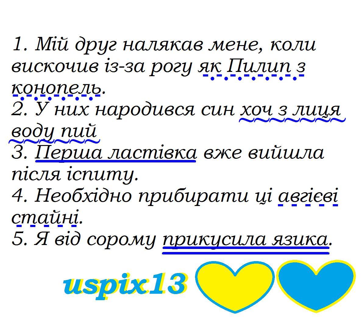 Запиши речення. Підкреслити фразеологізми відповідно до синтаксичної ролі.