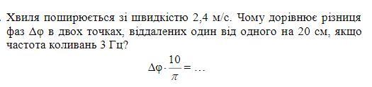 Хвиля поширюється зі швидкістю 2,4 м/с. Чому дорівнює різниця фаз Δφ в двох точках, віддалених один від одного на 20 см, якщо частота коливань 3Гц?