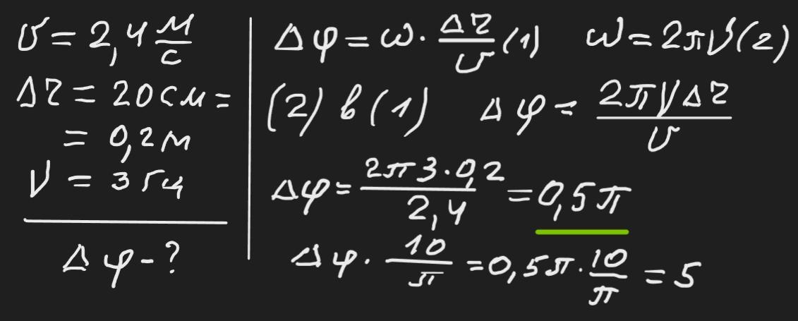 Волна распространяется на скорости 2,4 м/с. Чему равна разность фаз Δφ в двух точках, удаленных друг от друга на 20 см, если частота колебаний 3Гц?
