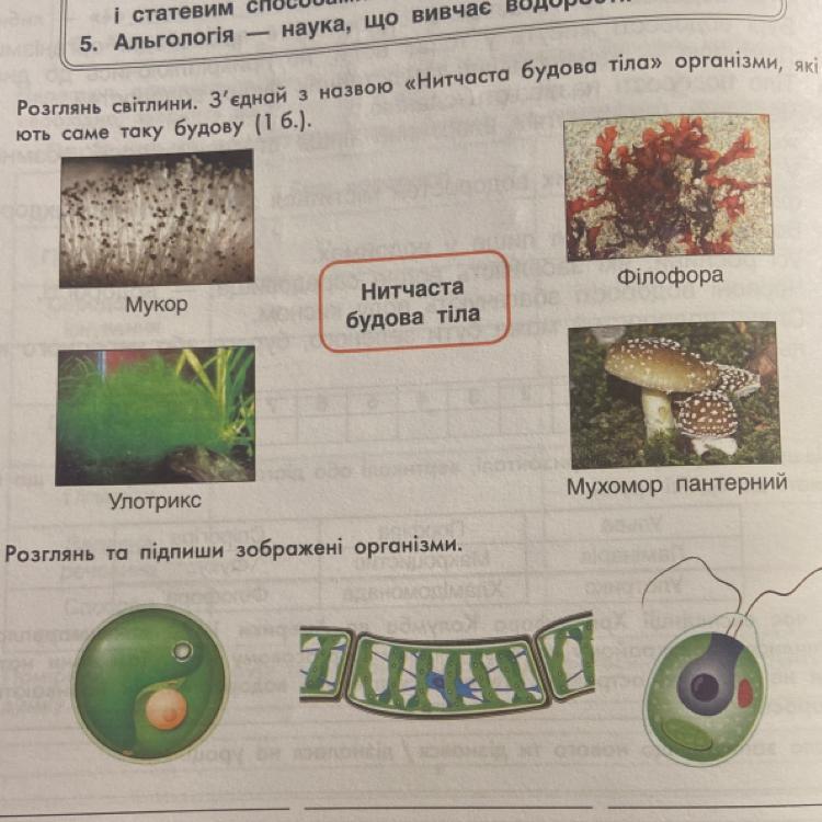 2. Розглянь світлини. З'єднай з назвою «Нитчаста будова тıла» організми, які мають саме таку будову