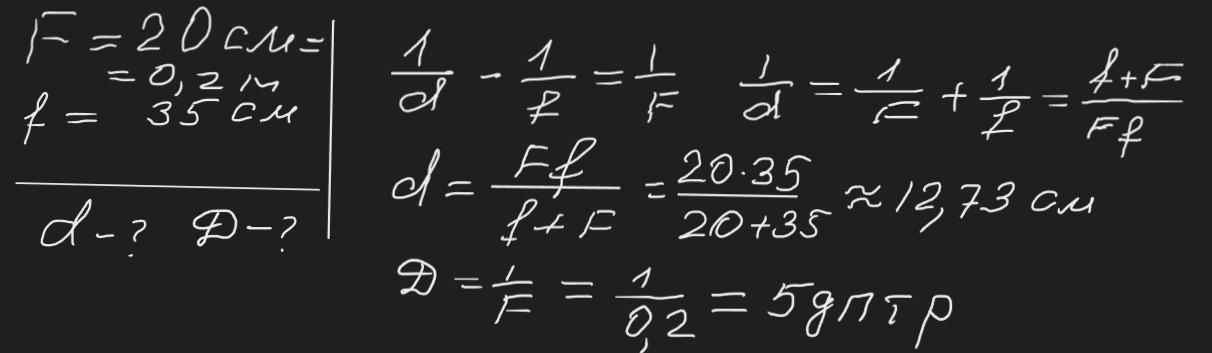 Фокусна відстань лінзи 20 см. На якій відстані від лінзи необхідно розмістити предмет, щоб його уявне зображення було на відстані -35 см від лінзи? Яка оптична сила цієї лінзи?