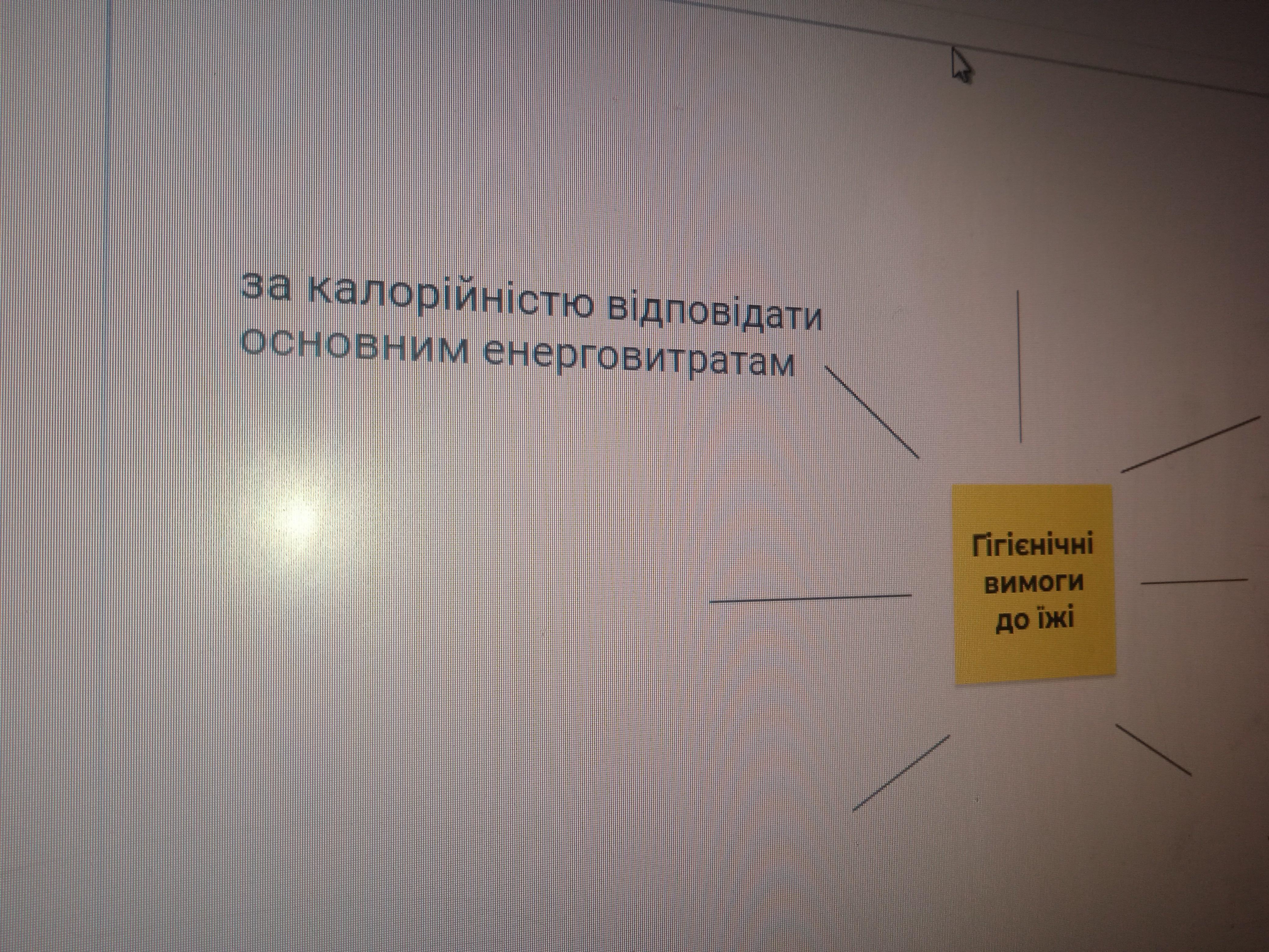 Відповідь:До їжі ставлять такі гігієнічні вимоги: достатність щодо кількості, тобто відповідність енергетичним витратам людини; повноцінність щодо якості, тобто вміст необхідних харчових раціонально збалансованих речовин (білків, жирів, вуглеводів, вітамінів, мінеральних речовин); різноманітність (складатися із продуктів