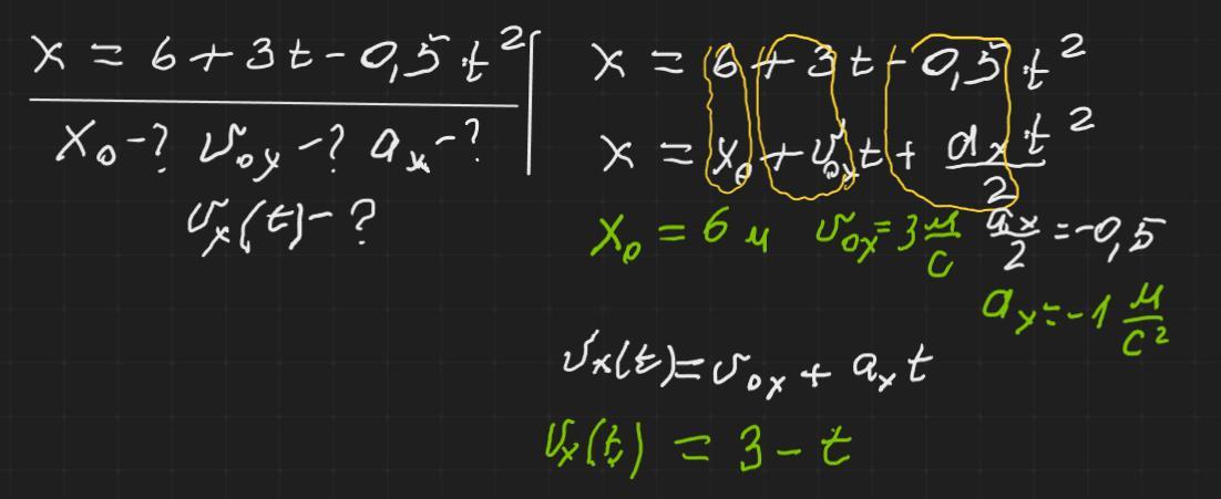 Відповідь: На протязі 0≤t≤3 c рівносповільнений у додатному напрямі осі Ох, після t=3 с - рівноприскорений у від'ємному напрямі осі Ох. Початкова координата 6 м, швидкість в початковий момент руху 3 м/с , прискорення - 1 м/с²
