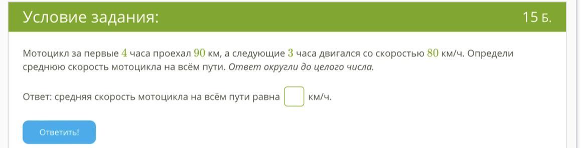 Мотоцикл за первые 4 часа проехал 90 км, а следующие 3 часа двигался со скоростью 80 км/ч. Определи среднюю скорость мотоцикла на всём пути. Ответ округли до целого числа.