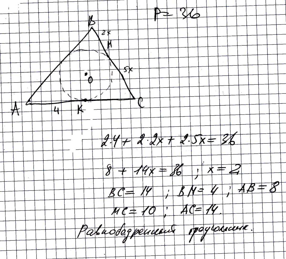 Периметр треугольника АВС, описанного около окружности равен 36. Точка касания окружности со стороной ВС делит ее в отношении 2:5, считая от точки В, а точка касания со стороной АС удалена от точки А на 4. Найдите длину стороны АВ.