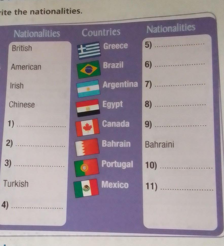 Here you need to find out the nationalities of the countries that are written in the frame "Countries"