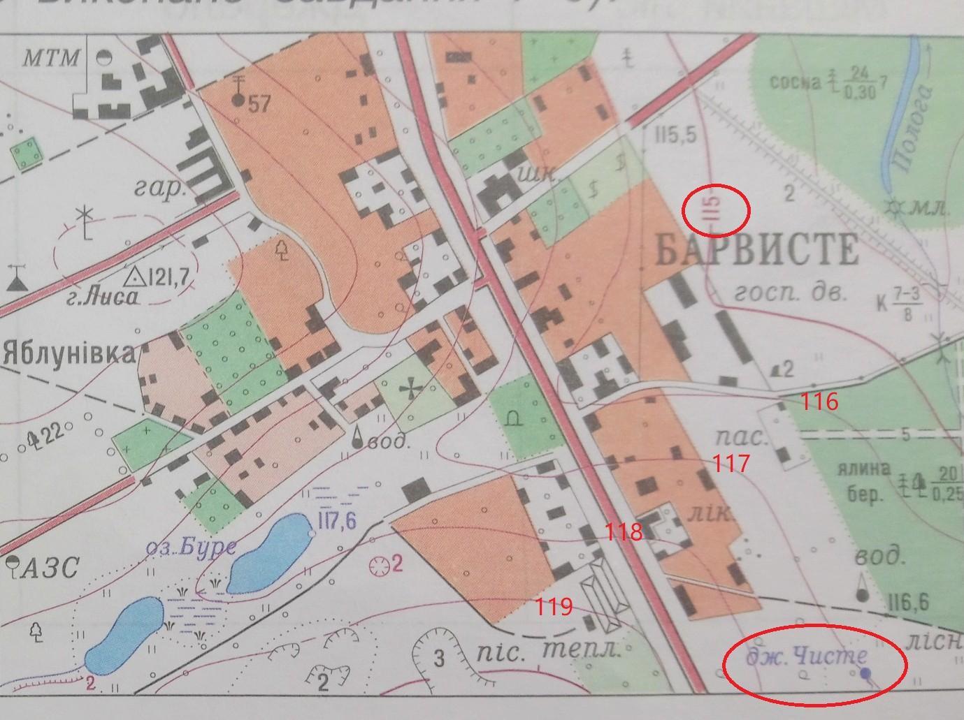 - Абсолютна висота джерела Чисте, якщо висота перерізу рельєфу становить 1м, буде 117 м