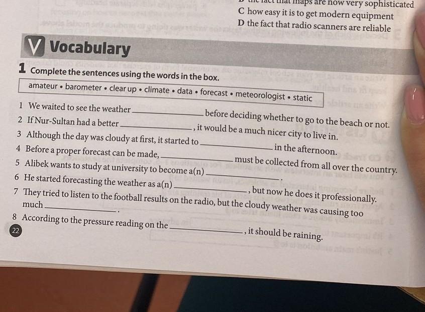 V Vocabulary 1 Complete the sentences using the words in the box. amateur barometer clear up climate data ● forecast ● 2 ● 1 We waited to see the weather. If Nur-Sultan had a better. meteorologist before deciding whether to go to the beach or not. ., it would be a much nicer city to live in. in the afternoon. must be collected from all over the country. . ● . static 3 Although the day was cloudy at first, it started to. 4 Before a proper forecast can be made,. 5 Alibek wants to study at university to become a(n). 6 He started forecasting the weather as a(n). , but now he does it professionally. 7 They tried to listen to the football results on the radio, but the cloudy weather was causing too much. 8 According to the pressure reading on the. -, it should be raining. 22