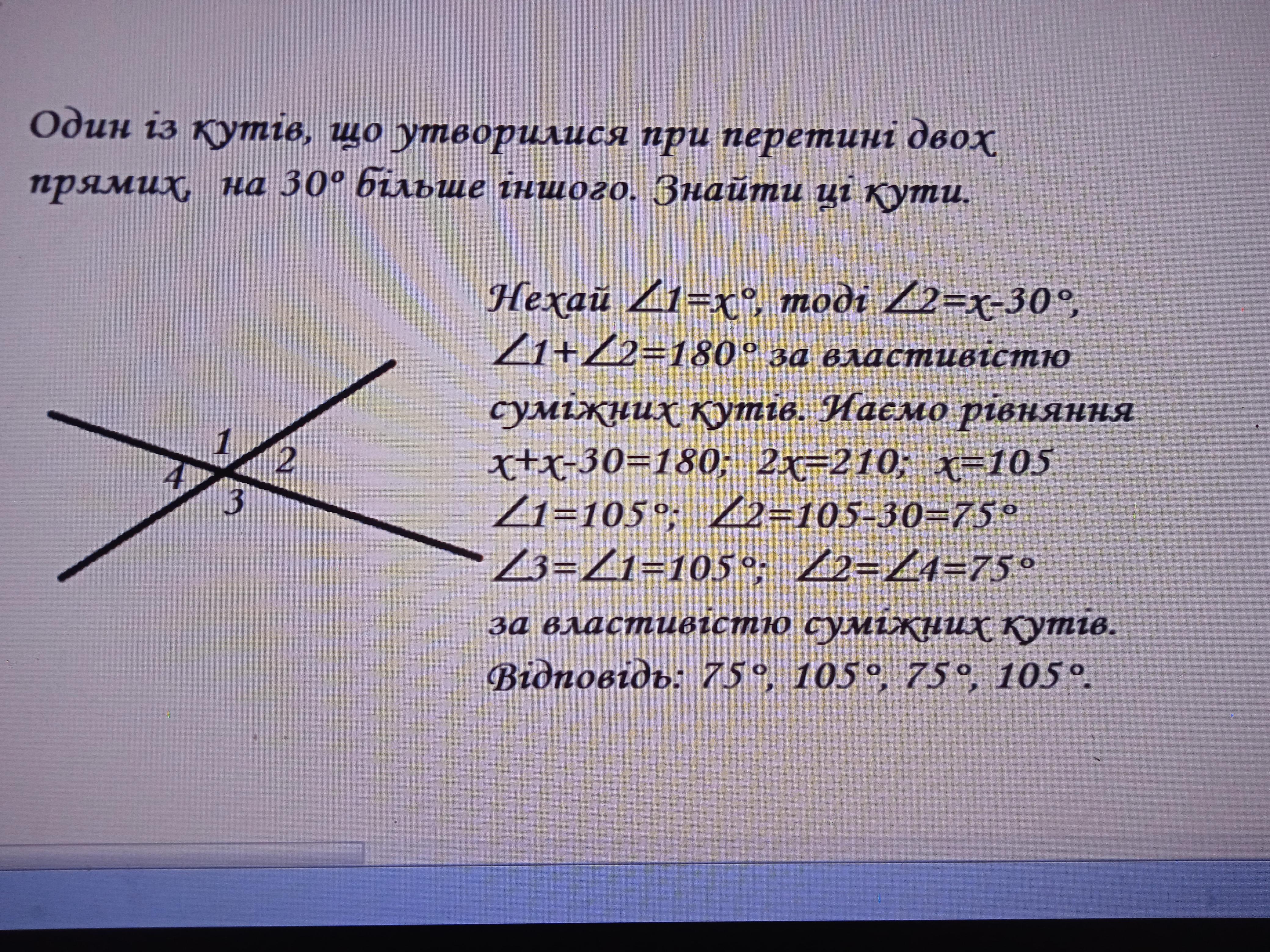 6. Один із кутів, що утворилися при перетині двох прямих на 30º більше іншого. Знайти шi кути.