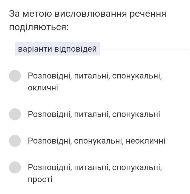 За метою висловлювання речення бувають розповідні, питальні, спонукальні.
