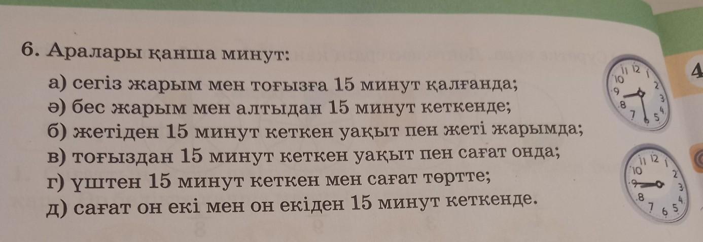 6. Аралары қанша минут: а) сегіз жарым мен тоғызға 15 минут қалғанда; ә) бес жарым мен алтыдан 15 минут кеткенде; б) жетіден 15 минут кеткен уақыт пен жеті жарымда; в) тоғыздан 15 минут кеткен уақыт пен сағат онда; г) үштен 15 минут кеткен мен сағат төртте; д) сағат он екі мен он екіден 15 минут кеткенде. O