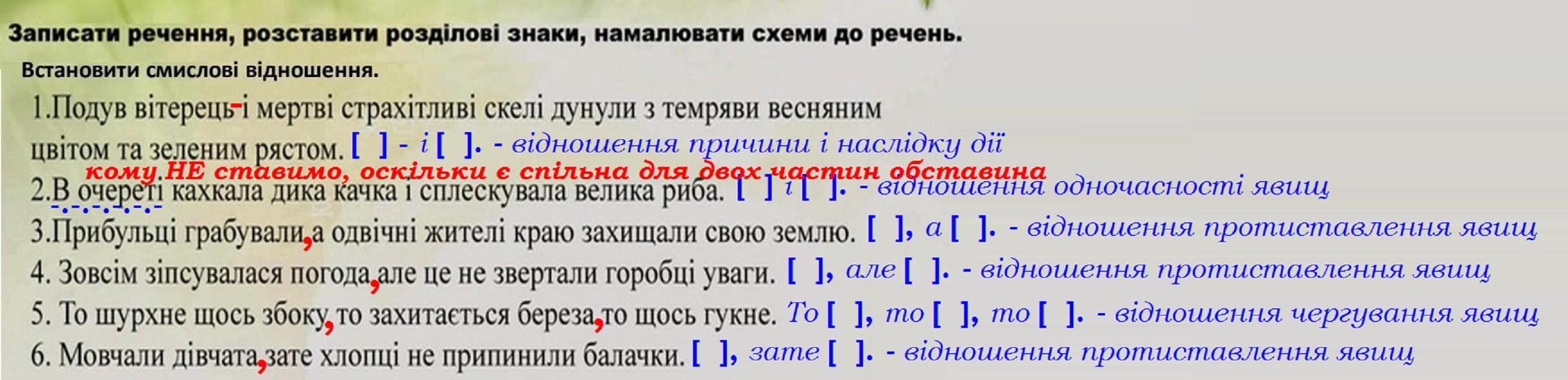 Записати речення, розставити роздiловi знаки, намалювати схеми до речень. Встановити смислові відношення