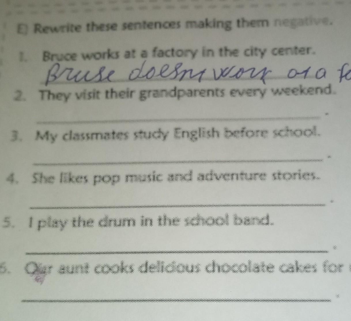 E) Rewrite these sentences making them negative. 1. Bruce works at a factory in the city center. Bruse doesny work of a 2. They visit their grandparents every weekend. 3. My classmates study English before school. 4. She likes pop music and adventure stories. 5. I play the drum in the school band. хологу 6. Qur aunt cooks delicious chocolate cakes for us. XRe Copyright ©16/05/2020 WA 46