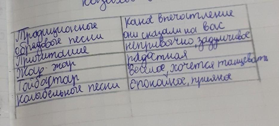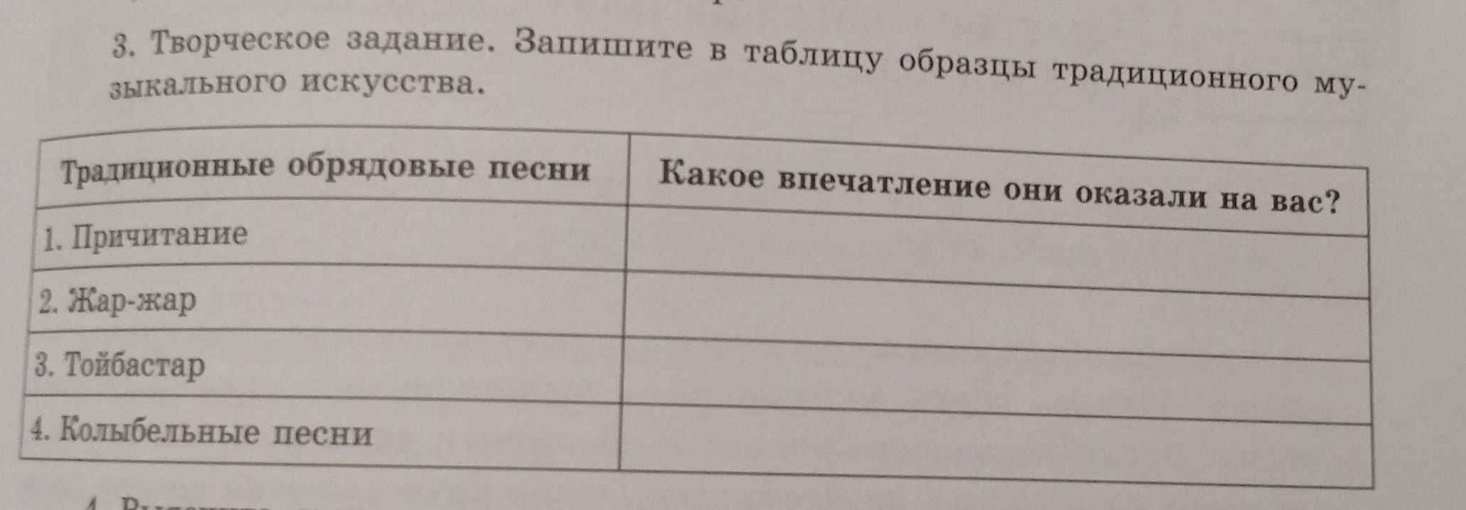 3. Творческое задание. Запишите в таблицу образцы традиционного му- зыкального искусства. Традиционные обрядовые песни Какое впечатление они оказали на вас? 1. Причитание 2. Жар-жар 3. Тойбастар 4. Колыбельные песни