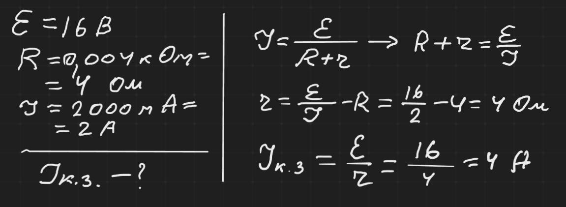 До джерела струму з EPC 16 В приєднують провідник, зовнішній опір якого дорівнює 0, 004 кОм. Сила струму, що виникає в колі 2000 мА. При цьому виникає явище короткого замикання. Яка сила струму в цей момент?