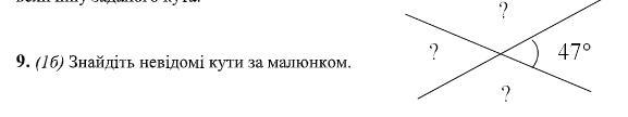 Той що навпроти кута 47° дорівнює 47° тому що вони вертикальні. Верхні кути: 180° (бо суміжні кути)- 47° дорівнює 133° (верхній і нижній кожний)
