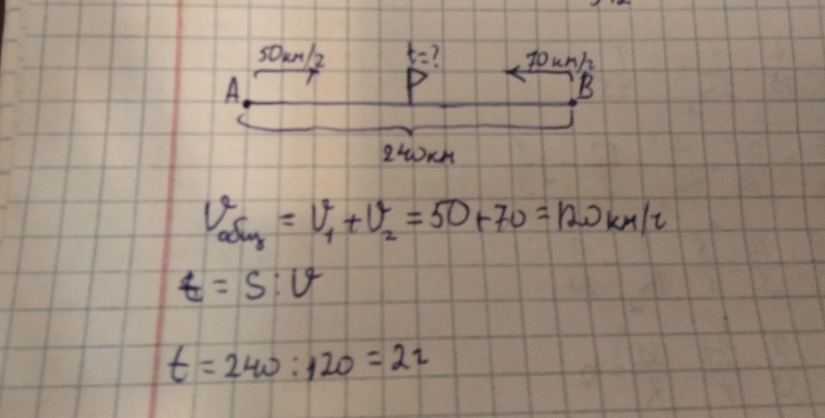 Расстояние между двух городов составляет 240 км. Два автомобилиста из обоих городов ехали навстречу друг другу одновременно со скоростью 50 км/ч и 70 км/ч. Через сколько они встретятся?