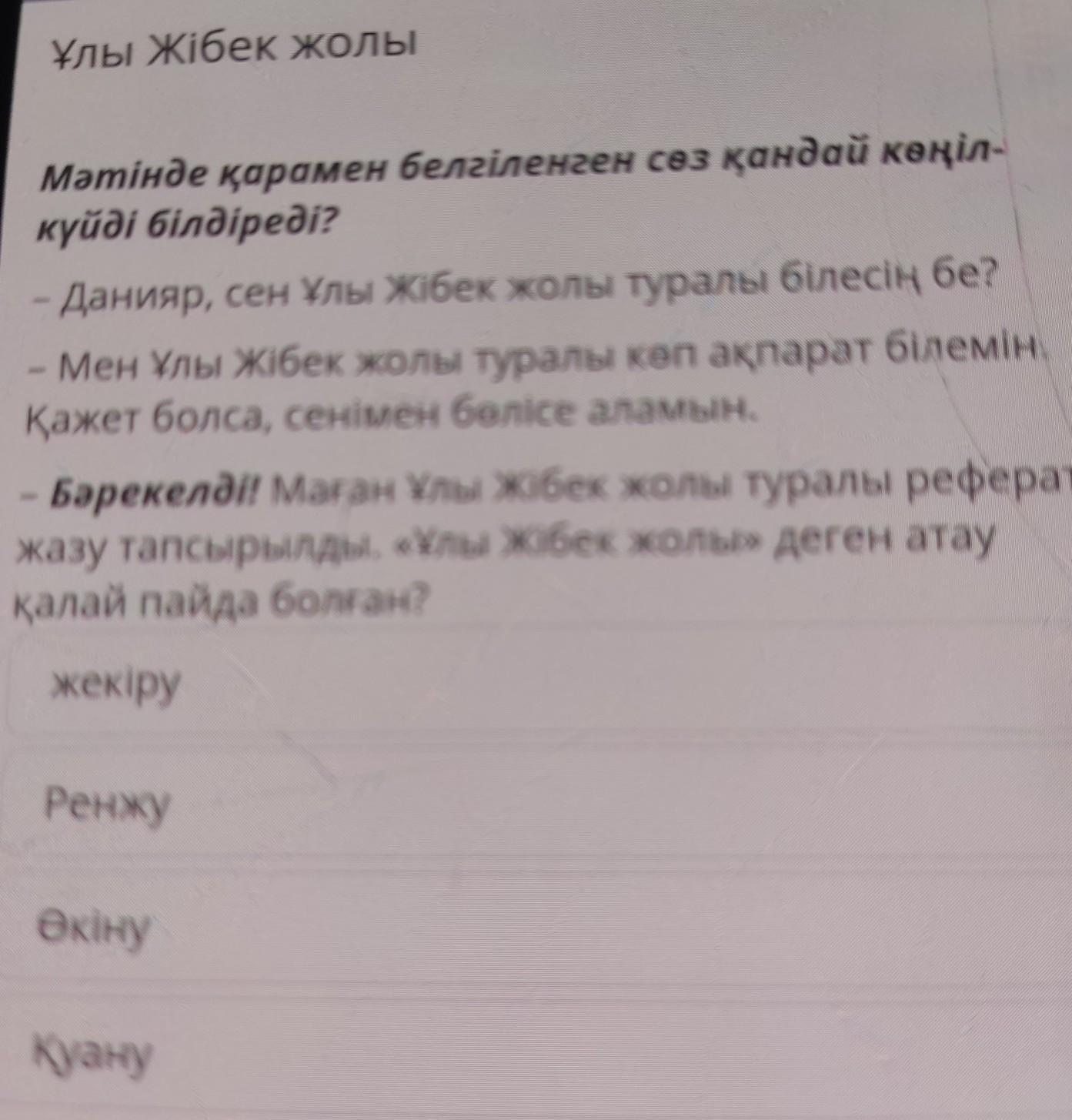Мәтінде қарамен белгіленген сөз қандай көңіл- күйді білдіреді? - Данияр, сен Ұлы Жібек жолы туралы білесің бе? - Мен Ұлы Жібек жолы туралы көп ақпарат білемін. Қажет болса, сенімен бөлісе аламын. Бәрекелді! Маған Ұлы Жібек жолы туралы реферат жазу тапсырылды. «Ұлы Жібек жолы» деген атау қалай пайда болған? Жекіру Ренжу Өкіну Қуану