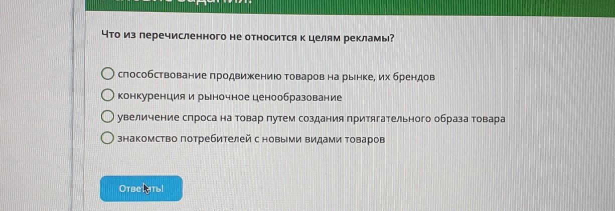Что из перечисленного не относится к целям рекламы? способствование продвижению товаров на рынке, их брендов конкуренция и рыночное ценообразование увеличение спроса на товар путем создания притягательного образа товара знакомство потребителей с новыми видами товаров