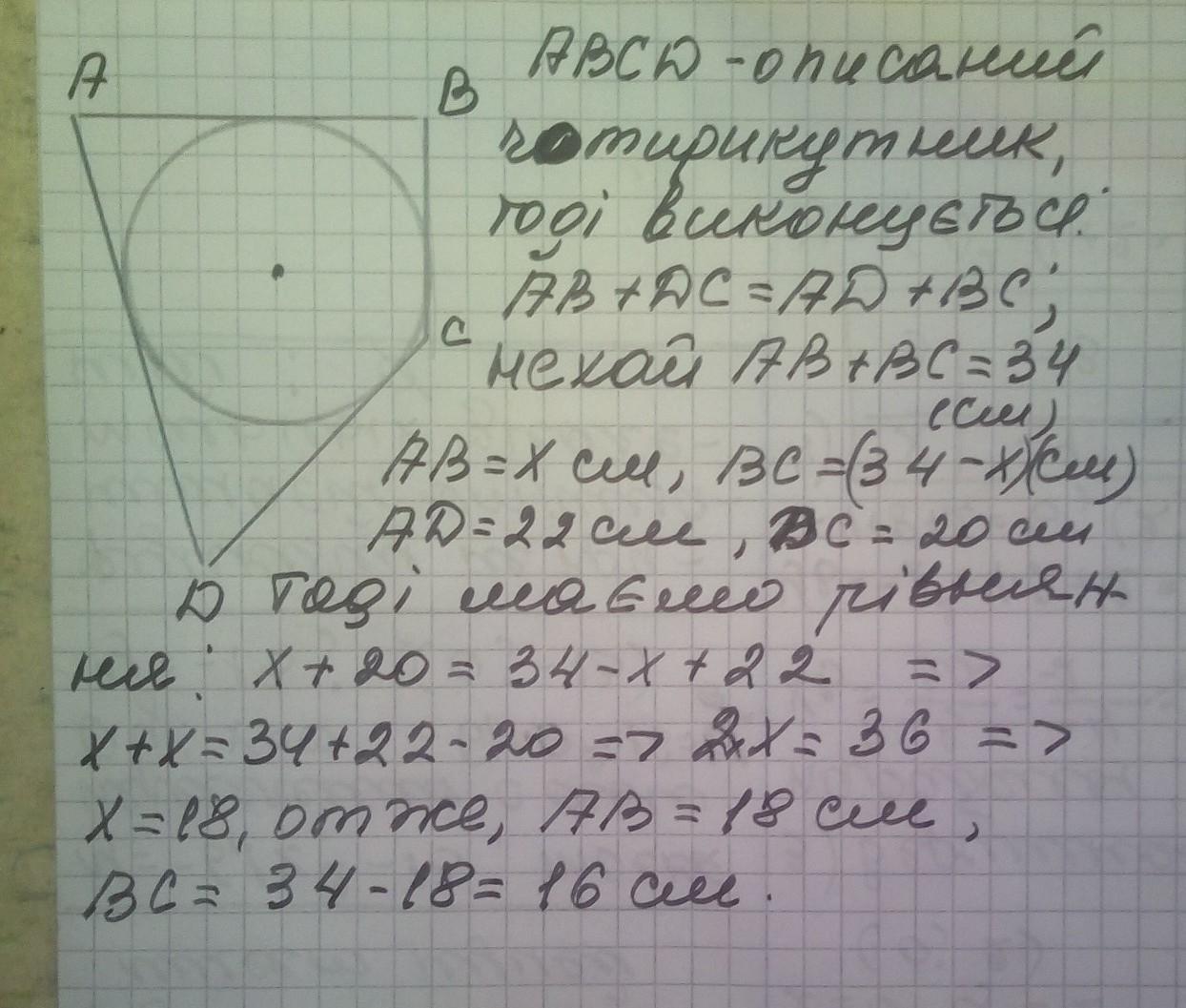 сума двох сусідніх сторін описаного чотирикутника дорівнює 34 см. дві інші сторони дорівнюють 20см і 22см. знайти невідомі сторони чотирикутника