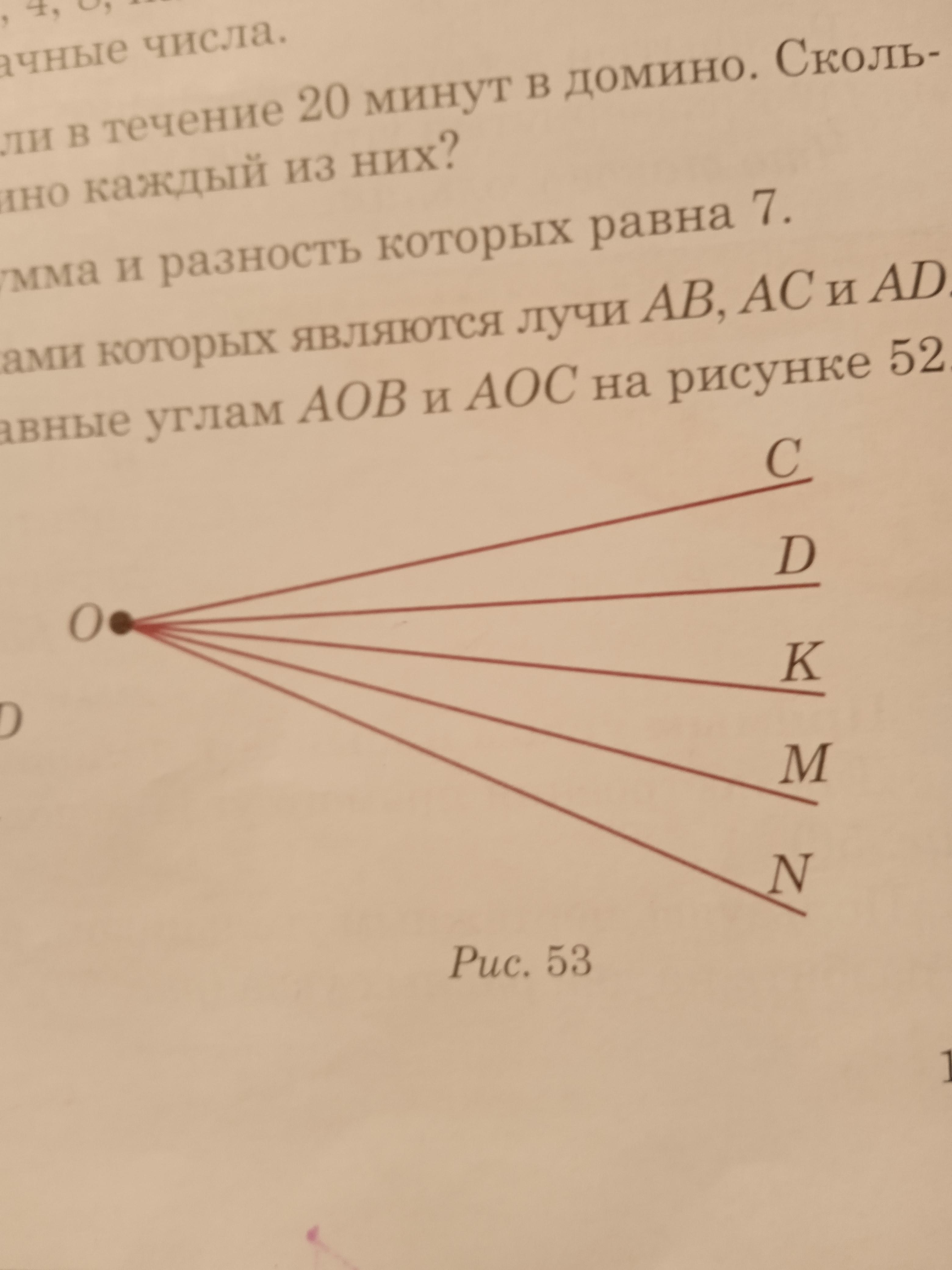 На рисунке 53 луч od является биссектрисой угла cok, луч ok-бисекрисой угла dom, луч om- биссектрисой угла kon. Является ли луч ok биссектрисой угла con?