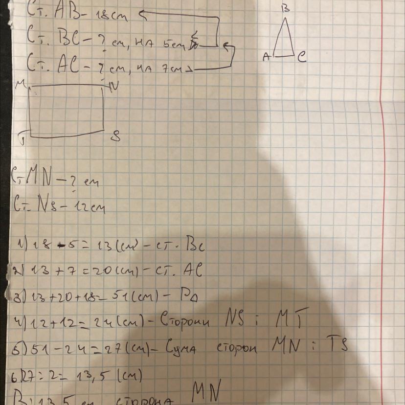 Трикутник АВС і прямокутник MNST мають рівні периметри. У трикутнику сторона АВ дорівнює 18 см, що на 5 см більше за ВС і на 7 см менше від АС. Знайдіть довжину сторони MN прямокутника MNST, якщо NS дорівнює 12 см