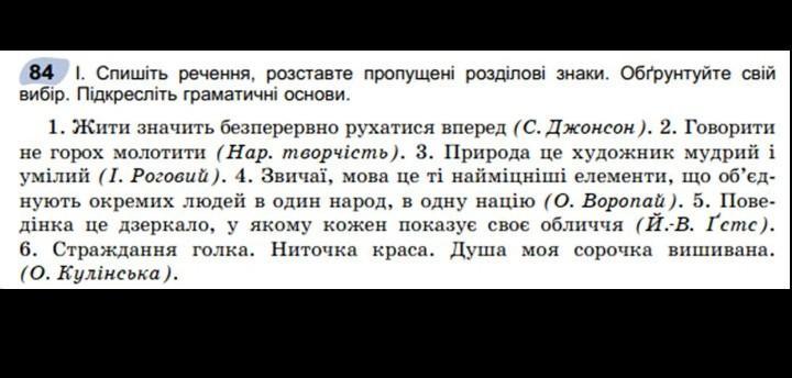 84 1. Спишіть речення, розставте пропущені розділові знаки. Обґрунтуйте свій вибір. Підкресліть граматичні основи. 1. Жити значить безперервно рухатися вперед (С. Джонсон). 2. Говорити не горох молотити (Нар. творчість). 3. Природа це художник мудрий і умілий (1. Роговий). 4. Звичаї, мова це ті найміцніші елементи, що об'єд- нують окремих людей в один народ, в одну націю (О. Воропай). 5. Пове- Дiнка це дзеркало, у якому кожен показує своє обличчя (Й.-В. Ґсмc). 6. Страждання голка. Ниточка краса. Душа моя сорочка вишивана. (О. Кулінська).