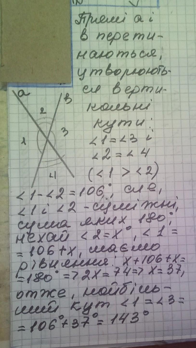 Різниця двох кутів, які утворилися в результаті перетину двох прямих, дорівнює 106°. Знайдіть найбільший із чотирьох утворених кутів