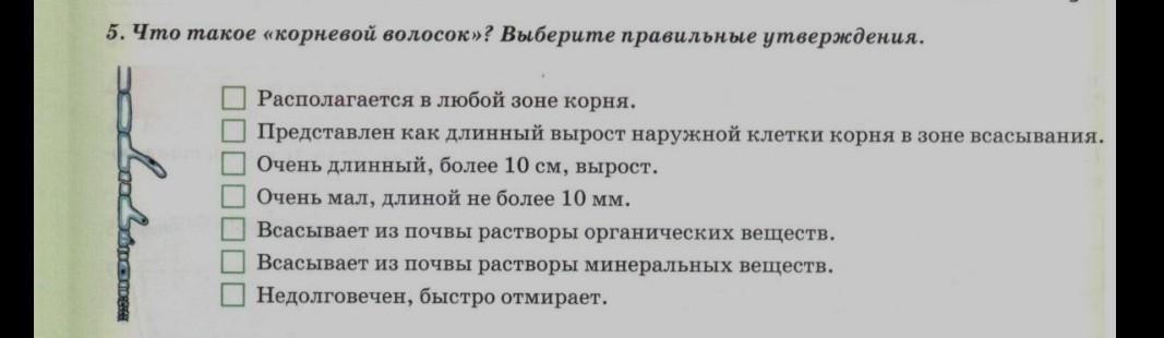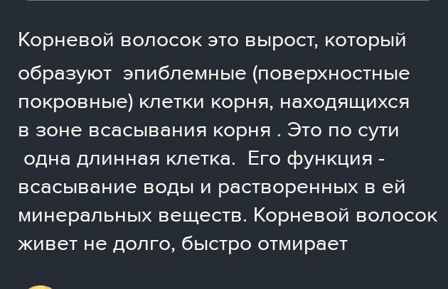 Корневые волоски представляют собой длинные тонкие нитевидные клеточные выросты, в которые перемещается ядро клетки. Функция корневых волосков — поглощение из почвы воды и минеральных веществ. По мере роста корня они разрушаются, кожица корня (ризодерма) обычно замещается пробкой, и зона всасывания замещается зоной проведения.