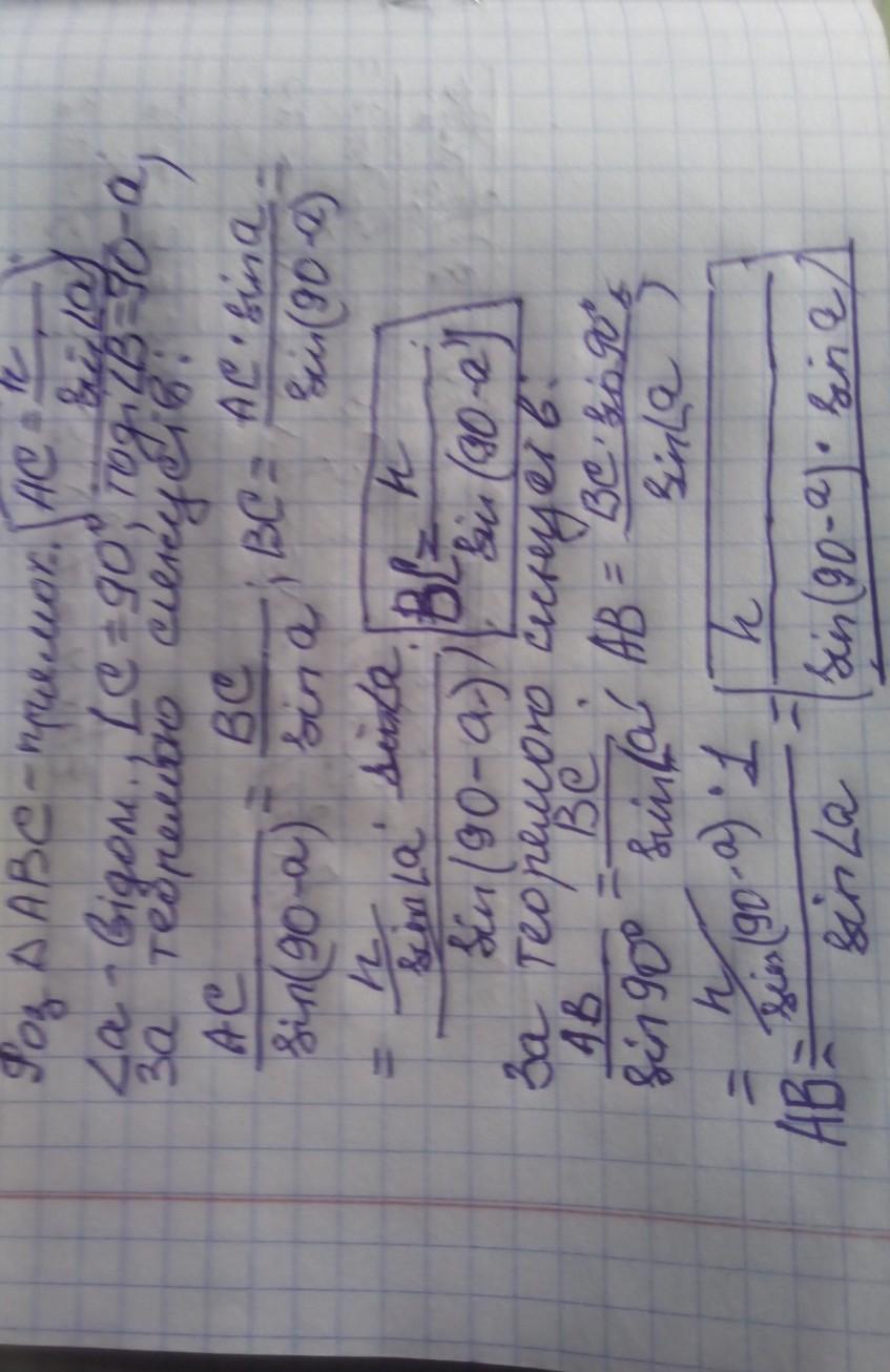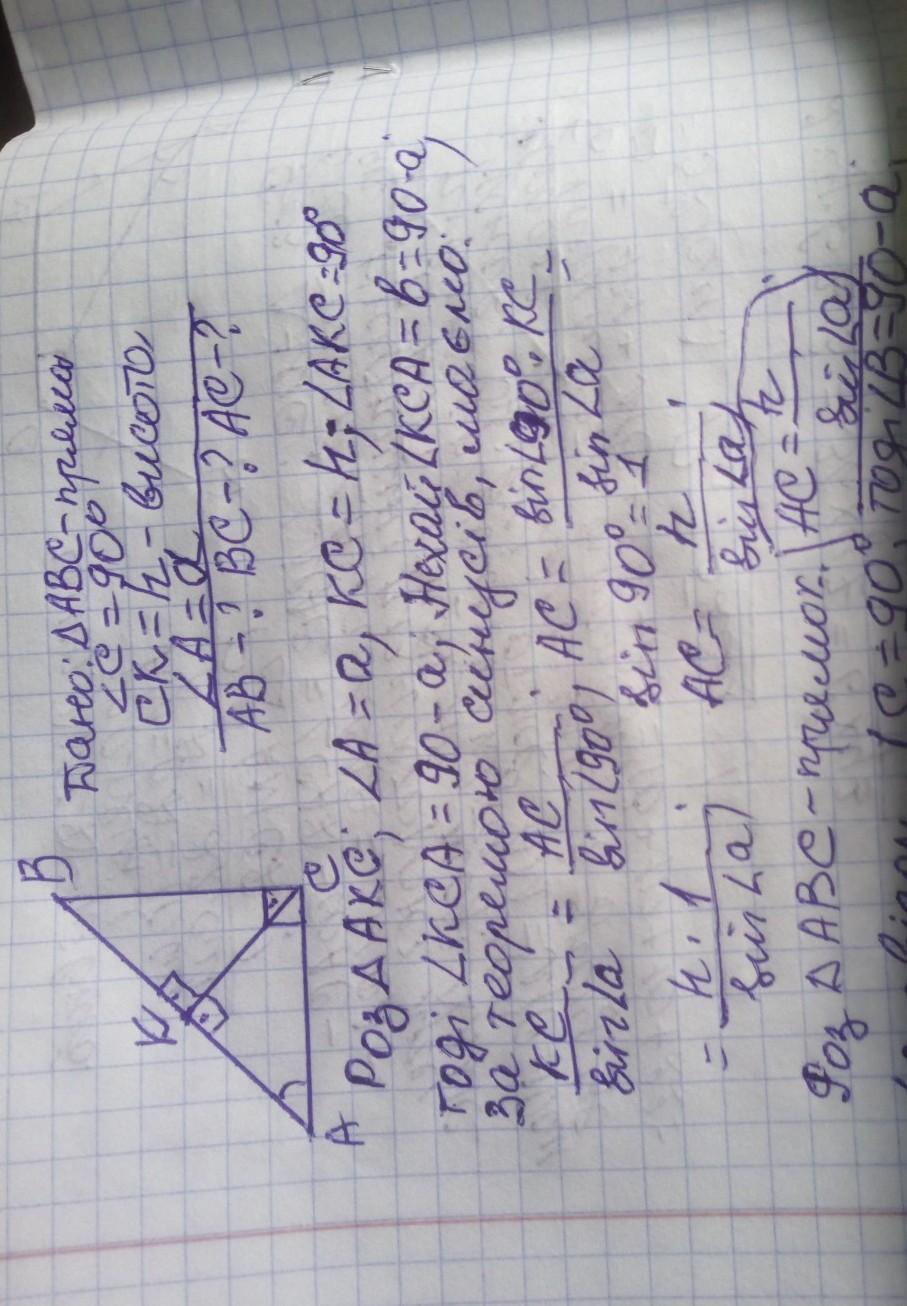 Высота, проведённая из вершины прямого угла треугольника, равна h, острый угол равен a. Найдите стороны треугольника.