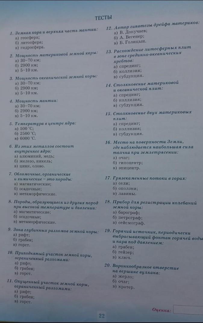 1. Земная кора и верхняя часть мантии: a) reocdepa; б) литосфера; в) гидросфера. 2. Мощность материковой земной коры: а) 30-70 км; б) 2900 км; в) 5-10 км. 3. Мощность океанической земной коры: а) 30-70 км; б) 2900 км; в) 5-10 км. 4. Мощность мантии: а) 30-70 км; 6) 2900 км; в) 5-10 км. 5. Температура в центре ядра: a) 500 °C; б) 2500 °C; в) 6000 °С. 6. Из этих металлов состоит внутреннее ядро: а) алюминий, медь; б) железо, никель; в) цинк, олово. 7. Обломочные, органические и химические - это породы: a) магматические; б) осадочные; в) метаморфические. ТЕСТЫ 8. Породы, образующиеся из других пород при высокой температуре и давлении: a) магматические; б) осадочные; в) метаморфические. 9. Зона глубинных разломов земной коры: а) рифт: б) грабен; в) горст. 10. Приподнятый участок земной коры, ограниченный разломами: а) рифт; б) грабен; в) горст. 11. Опущенный участок земной коры, ограниченный разломами: а) рифт: 6) грабен; в) горст. 22 12. Автор гипотезы дрейфа материков: а) В. Докучаев; 6) А. Вегенер; в) Б. Голицын. 13. Расхождение литосферных плит в зоне срединно-океанических хребтов: a) спрелинг; б) коллизия; в) субдукция. 14. Столкновение материковой и океанической плит: a) спрединг; б) коллизия; в) субдукция. 15. Столкновение двух материковых плим: a) спрединг; б) коллизия; в) субдукция. 16. Место на поверхности Земли, где наблюдается наибольшая сила толчка при землетрясении: а) очаг; б) гипоцентр; в) эпицентр. 17. Грязекаменные потоки в горах: a) сели; б) оползни; в) лавины. 18. Прибор для регистрации колебаний земной коры: а) барограф; б) петрограф; в) сейсмограф. 19. Горячий источник, периодически выбрасывающий фонтан горячей воды и пара под давлением: a) грабен; б) гейзер; в) ключ. 20. Воронкообразное отверстие на вершине вулкана: а) жерло; б) очаг; в) кратер. Оценка: