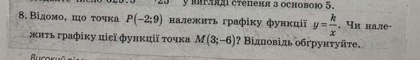 8. Известно, что точка P(-2; 9) принадлежит графику функции у=k/x. Принадлежит ли графику этой функции точка М (3; -6)? Ответ обоснуйте.