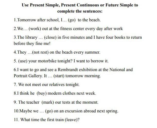 The 8th Form Test Use Present Simple, Present Continuous or Future Simple to complete the sentences: 1.Tomorrow after school, I... (go) to the beach. 2.We... (work) out at the fitness center every day after work 3.The library ... (close) in five minutes and I have four books to return before they fine me! 4. They...(not rest) on the beach every summer. 5. (use) your motorbike tonight? I want to borrow it. 6.I want to go and see a Rembrandt exhibition at the National and Portrait Gallery. It... (start) tomorrow morning. 7. We not meet our relatives tonight. 8.I think he (buy) modern clothes next week. 9. The teacher (mark) our tests at the moment. 10.Maybe we... (go) on an excursion abroad next spring. 11. What time the first train (leave)?