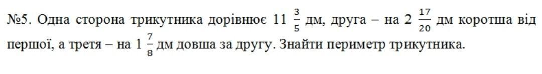 1) 11 3/5 - 2 17/20 = 11 12/20 - 2 17/20 = 10 32/20 - 2 17/20 = 8 15/20 = 8 3/4 (дм) - 2 сторона ∆