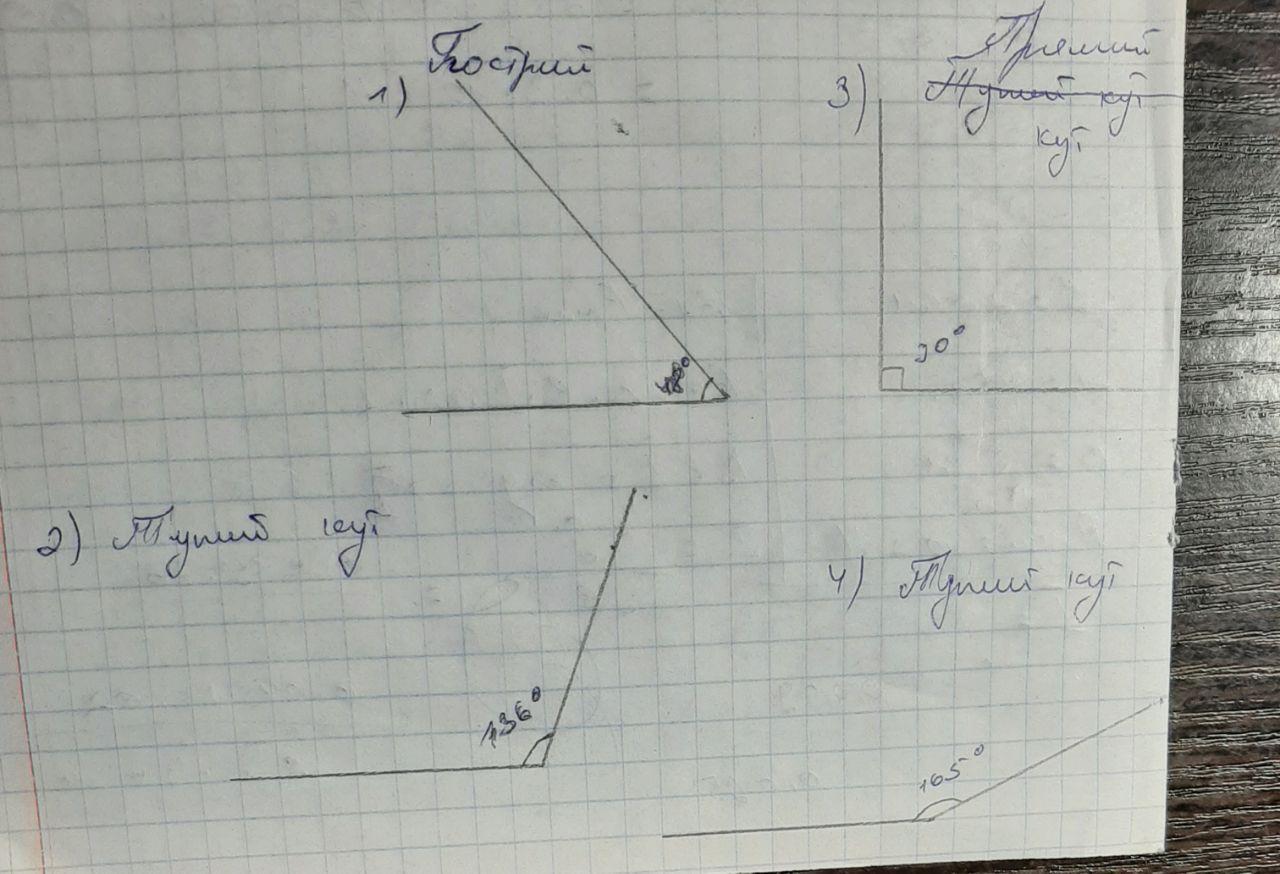 Накресліть кут, градусна міра якого дорівнює: 1) 48°; 2) 136°; 3) 90°; 4) 165°. Визначте вид кожного кута.
