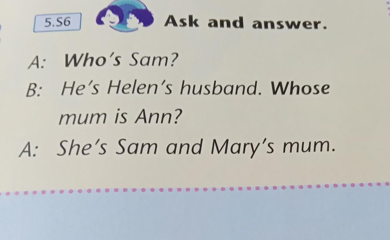 OF ● 8 3 5.56 Ask and answer. A: Who's Sam? B: He's Helen's husband. Whose mum is Ann? A: She's Sam and Mary's mum.
