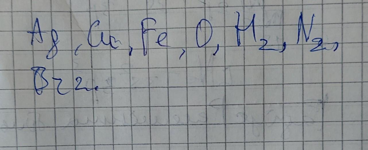 Ag, Cu, H 2 , H 2 SO 4 , Fe, P 2 O 5 , O, N 2 , Br 2 .