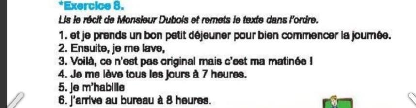 Je me lève tous les joures à 7 heures. Ensuite, je me lave, je m'abille et je prends un bon petit déjeuner pour bien commencer la journée. J'arrive au bureau à 8 heures. Voilà, ce n'est pas original mais c'est ma matinée!